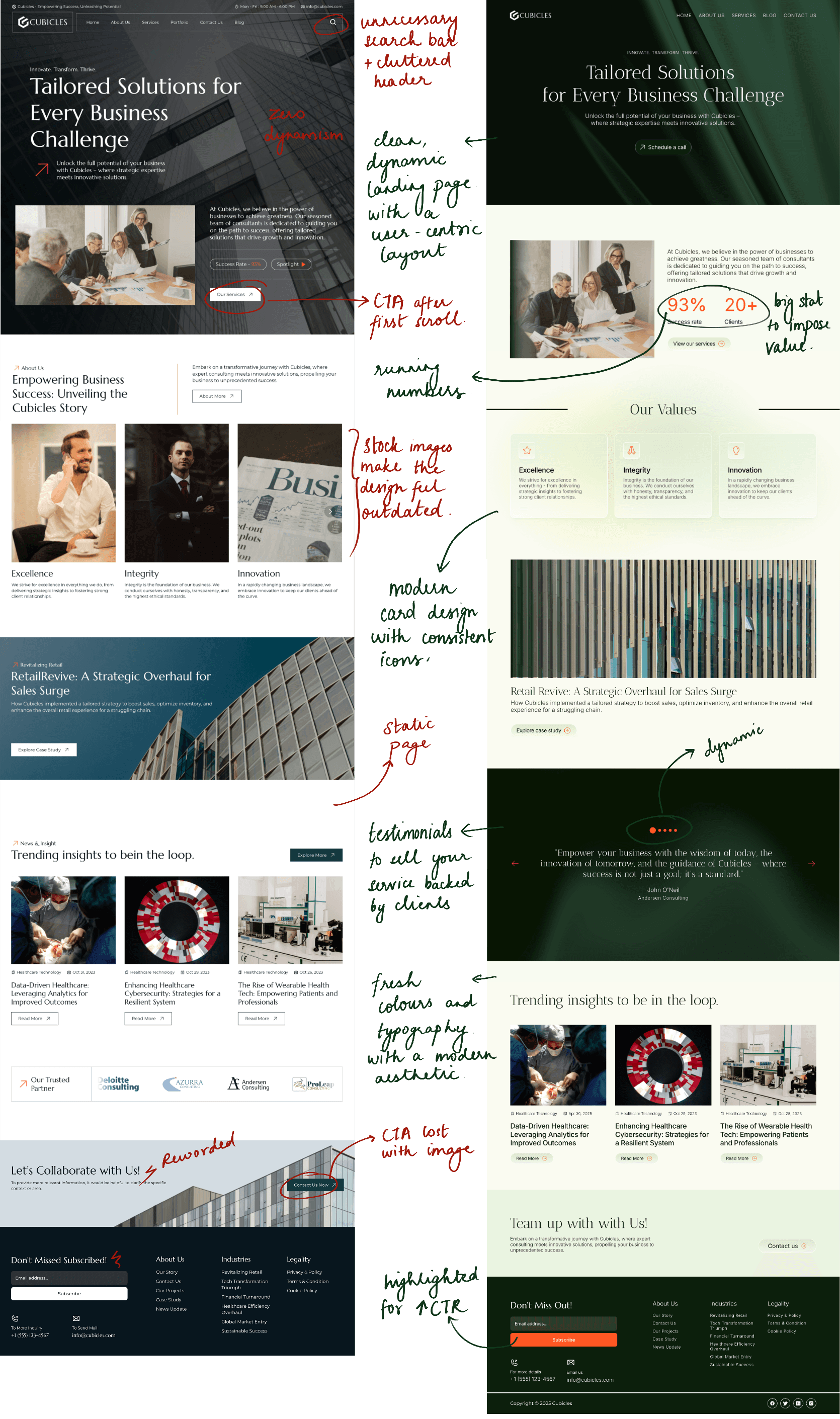 Redesigned with purpose, the landing page delivers a cleaner, more intuitive experience by improving readability through balanced typography and whitespace. Stronger brand alignment is achieved with a cohesive color palette and consistent visual elements, while focused CTAs guide users toward the most important actions. The layout is simplified and user-centric, ensuring smoother navigation and a more seamless flow across devices. Altogether, the updated design feels modern, engaging, and far more effective than the original.